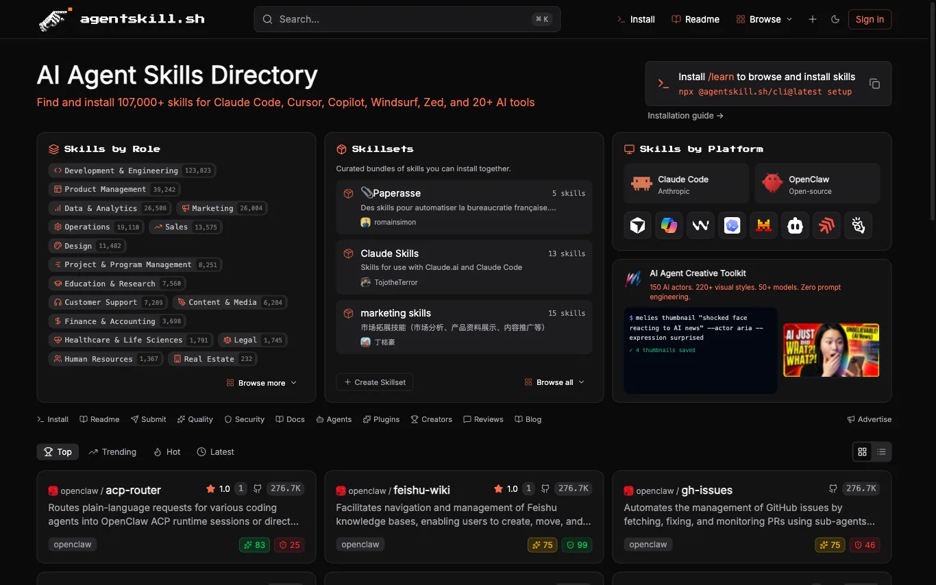 AgentSkill.sh is the largest AI agent skills directory, hosting 107,000+ skills for Claude Code, Cursor, Copilot, Codex, Windsurf, Zed, and 20+ tools. Skills are organized by role and can be installed with a single CLI command or browsed via the web.