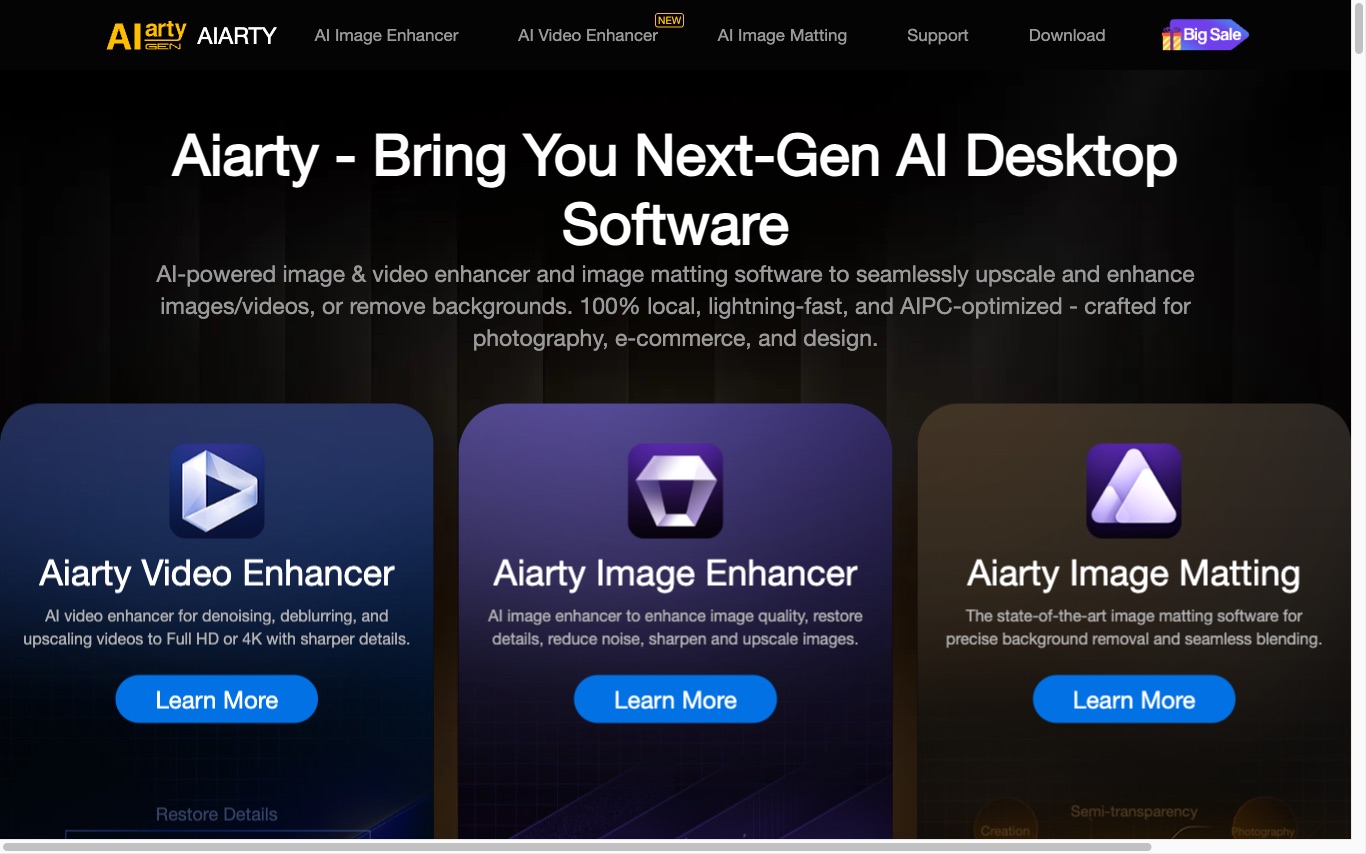 Aiarty is a suite of on-device AI desktop apps for image and video enhancement and image matting. Aiarty Image Enhancer upscales and denoises photos, Aiarty Video Enhancer upscales video to 4K, and Aiarty Image Matting cuts precise cutouts for e-commerce and design.