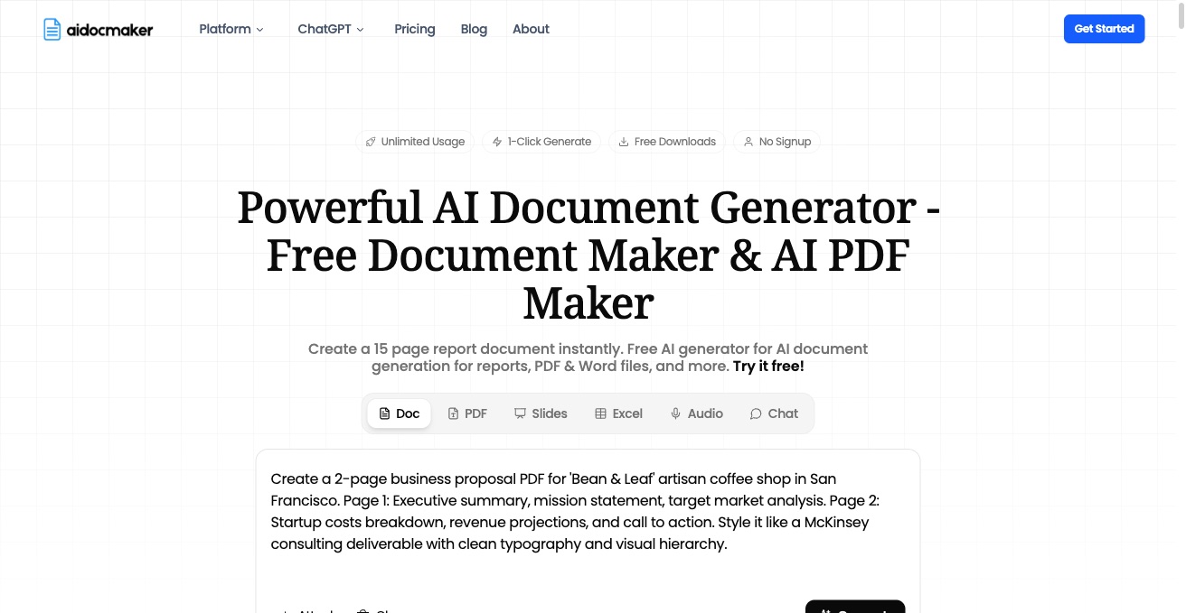 Agentic AI that drafts multi-page reports, PDFs, Word docs, slides, and spreadsheets from a single prompt with no signup.
