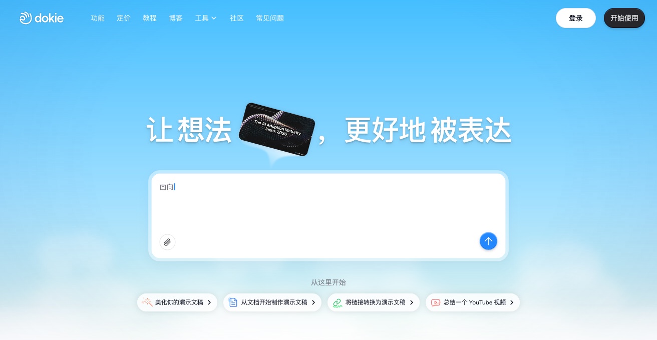 Dokie AI is an AI presentation maker used by 2M+ users. Start from documents, URLs, YouTube videos, or topics to generate brand-aligned slides with animations and interactivity.