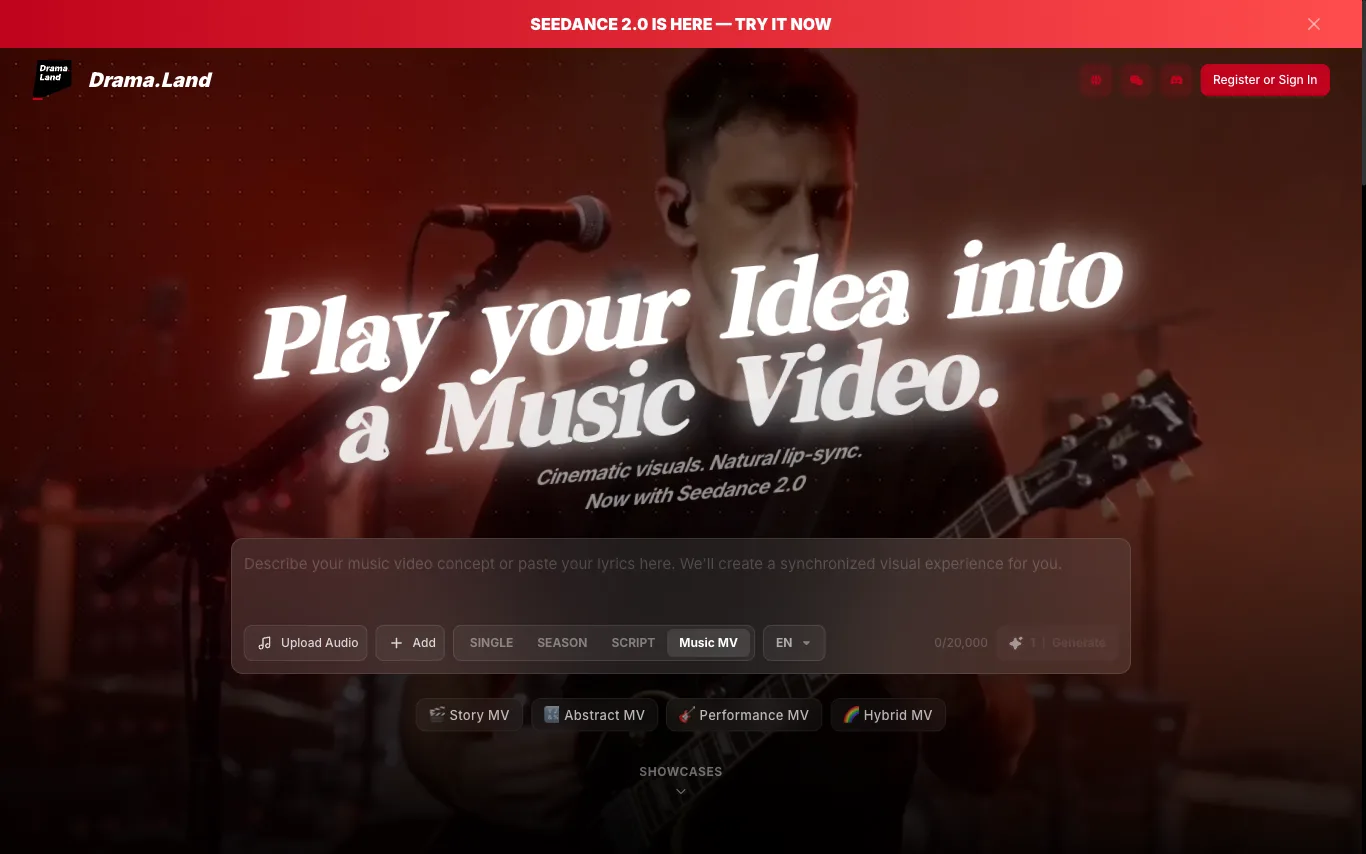 Drama.Land is an AI music video creation platform built for storytellers. It uses Seedance 2.0 to turn uploaded songs into cinematic music videos with natural lip-sync — available in Story, Abstract, Performance, and Hybrid MV formats. Creators can produce serialized content with consistent characters and visual styles.