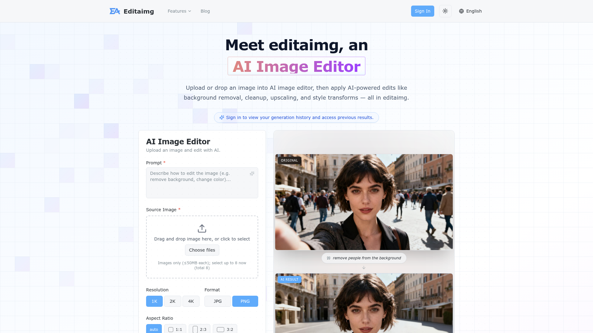 editaimg is an AI Image Editor that allows users to upload images and apply AI-powered edits such as background removal, cleanup, upscaling, and style transforms. Users can sign in to view their generation history and access previous results. The platform offers a range of practical features designed to enhance the editing workflow, from quick fixes to complex transformations. It provides tools for professional results, making advanced image editing accessible to everyone without requiring professional skills. Users can streamline their image work with non-destructive editing, instant previews, and one-click export. Key capabilities include replacing objects, creating realistic product shots, and removing unwanted elements from photos.