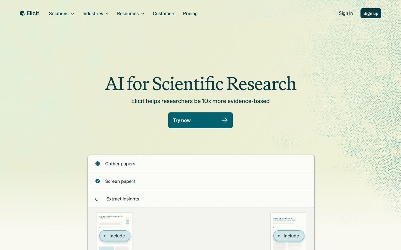 Elicit is an AI research assistant used by over 2 million researchers to search, summarize, and extract structured data from 125M+ scientific papers—streamlining systematic literature reviews and evidence synthesis.