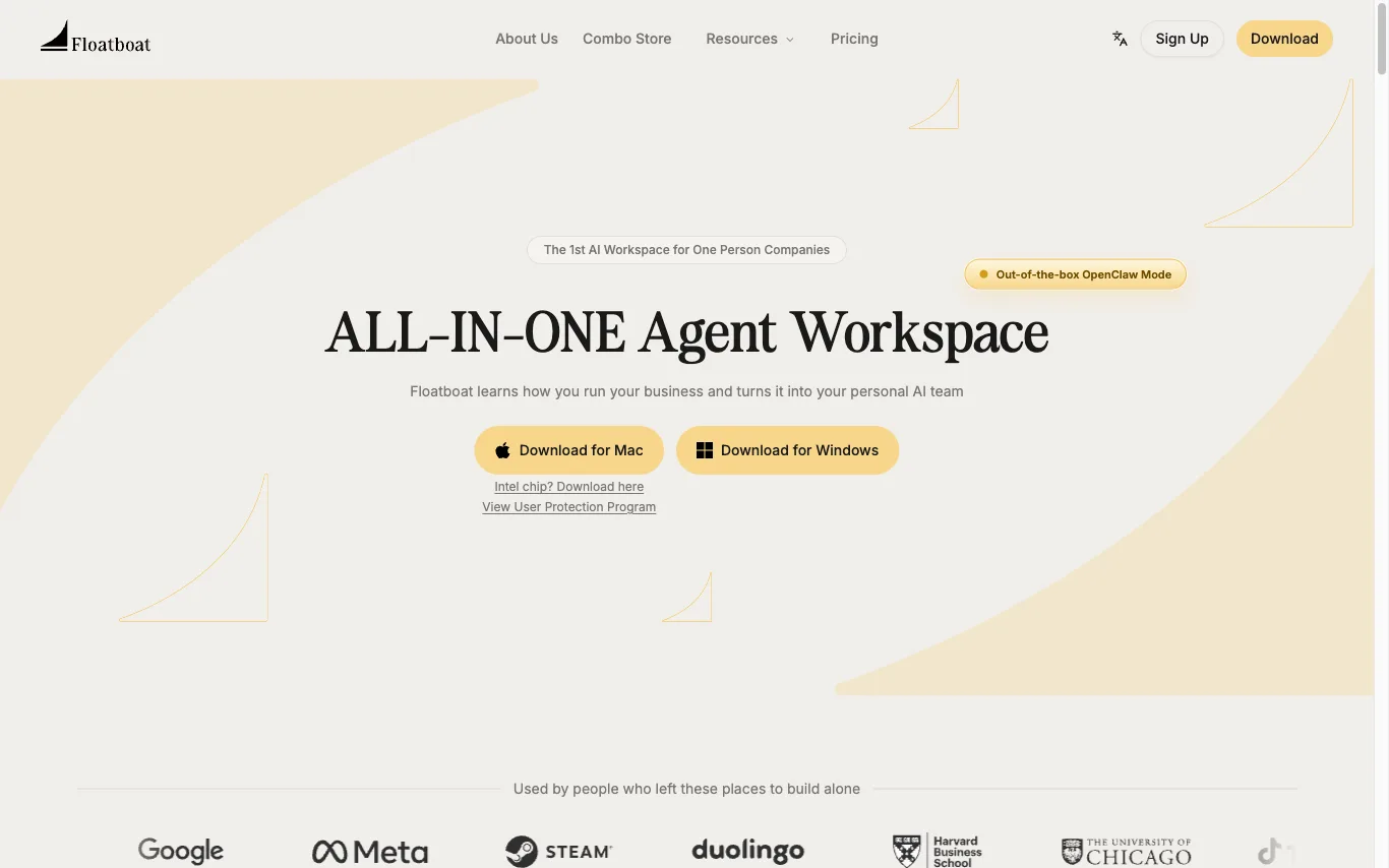 Floatboat is a native OS-level AI workspace for one-person companies. It sits on your desktop, processes local files without cloud uploads, integrates with 3500+ apps, and learns your decision patterns via the Tacit Engine — turning them into Combo Skills that automate repeatable work.