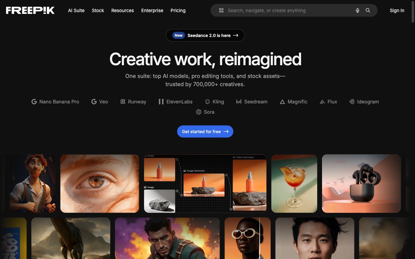Freepik is an AI creative suite that unifies image, video, and audio generators with an editor and a licensed stock library—letting creators move from prompt to finished asset in a single workspace.