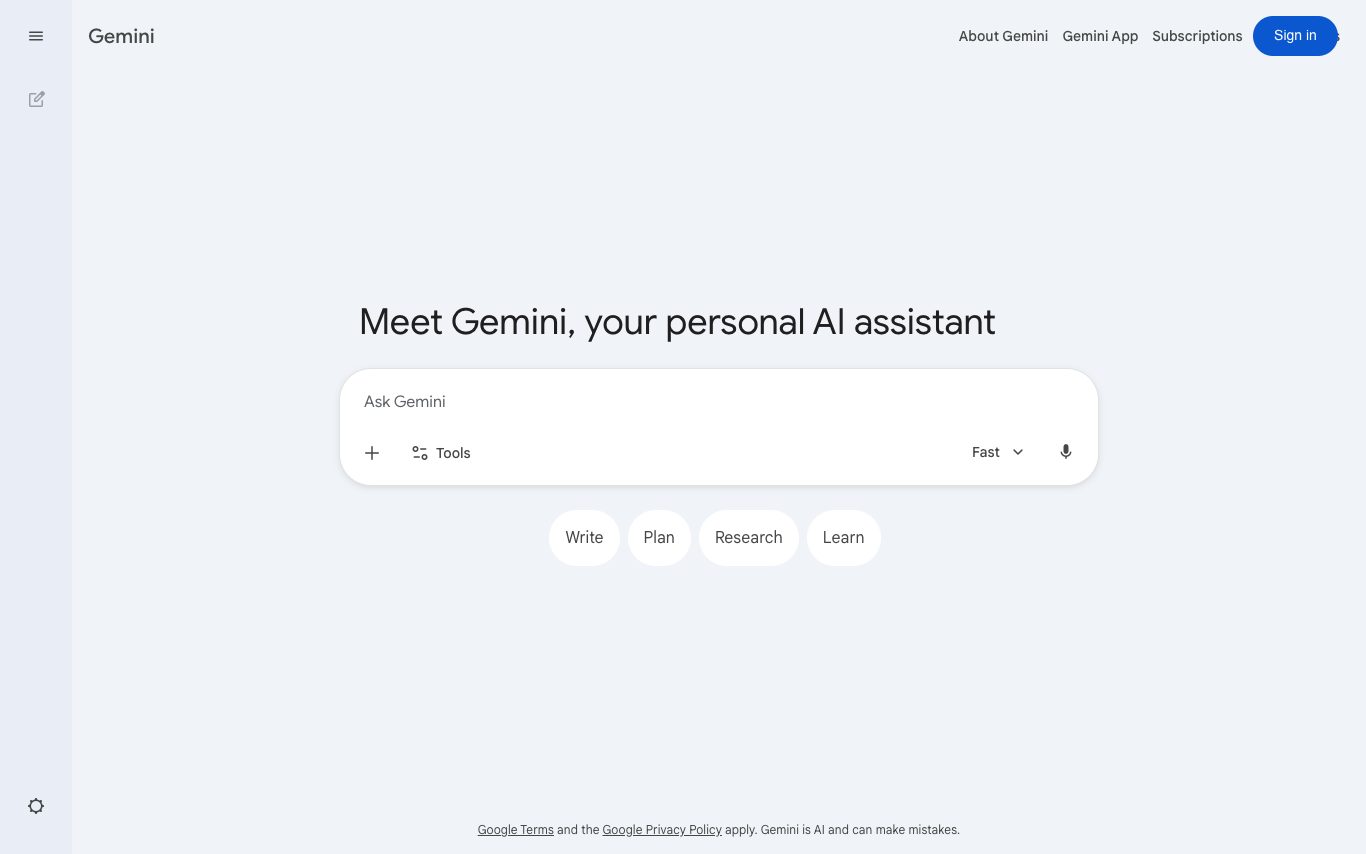 Gemini is Google's multimodal AI assistant, powered by the Gemini 2.5 model family. It supports text, image, audio, and video inputs, integrates with Gmail, Docs, Drive, and Calendar through Workspace, and adds deep reasoning via Gemini Advanced. Extensions connect Gemini to Maps, YouTube, and other Google services.