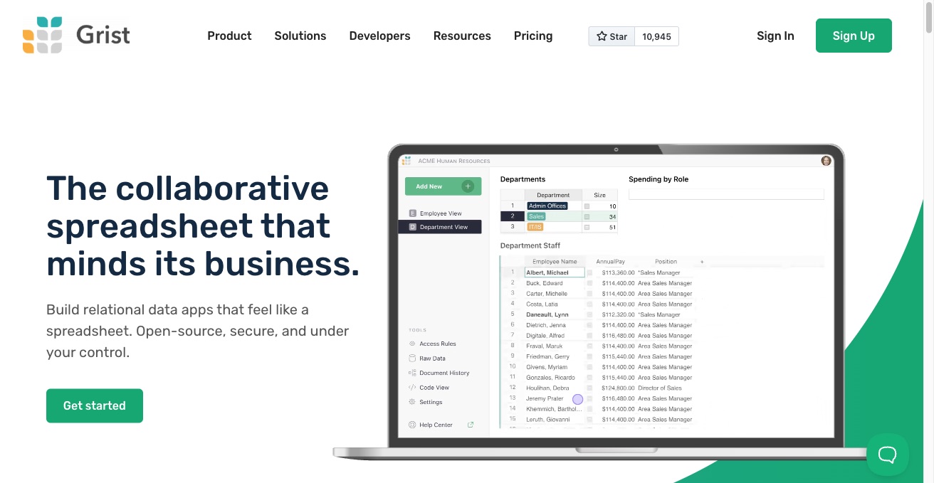 Grist is an open-source spreadsheet-database hybrid. Create relational tables, Python formulas, custom widgets, and AI-assisted data entry to replace messy spreadsheets.
