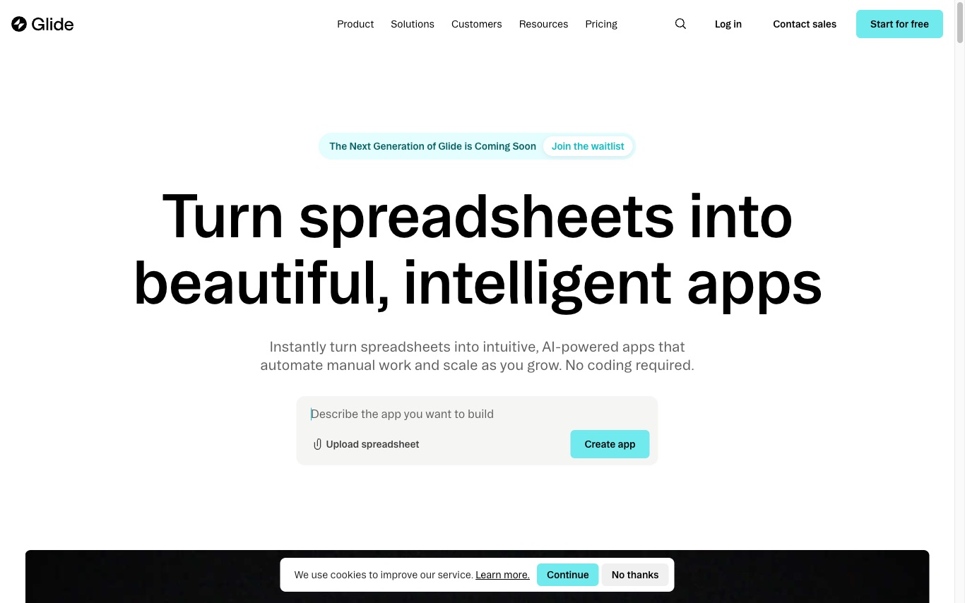 Glide is a no-code platform used by 100,000+ companies to turn spreadsheets into polished apps. Its visual builder, AI agents, and connected data sources replace clunky spreadsheets and rigid legacy tools.