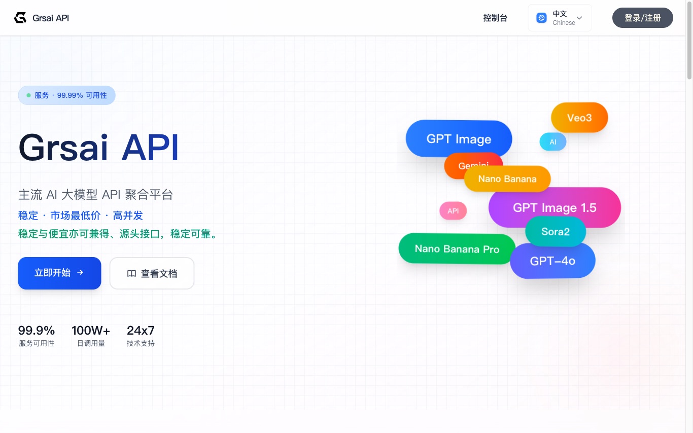 Grsai is an enterprise AI API aggregator that provides stable upstream access to mainstream image, video, and large-language models through one relay gateway. It emphasizes high concurrency, 99.99% availability, and below-market pricing sourced directly from upstream providers.