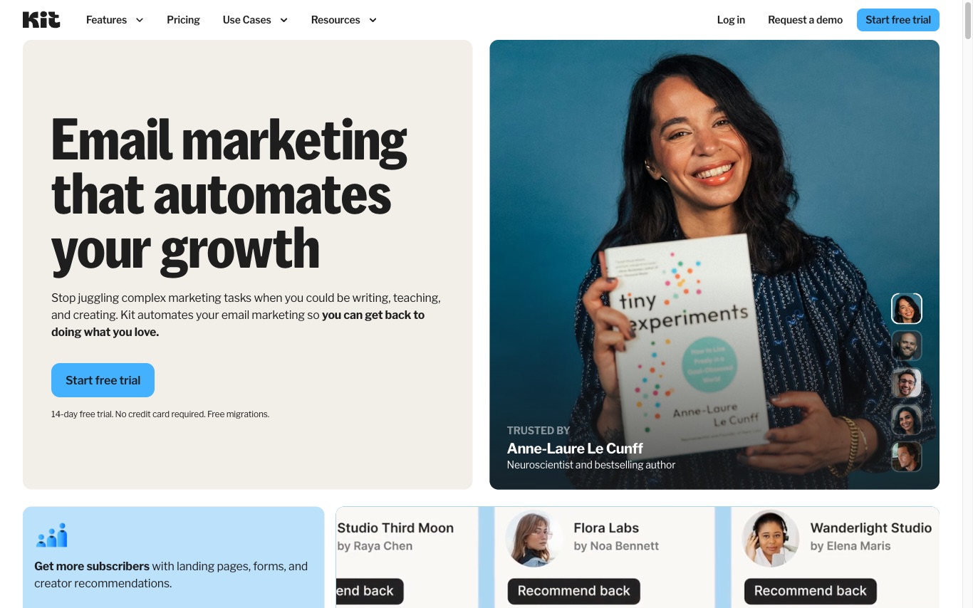 Kit (formerly ConvertKit) is an email marketing platform for creators. Build landing pages, send newsletters, automate sequences, earn recurring revenue with paid newsletters, and sell digital products.