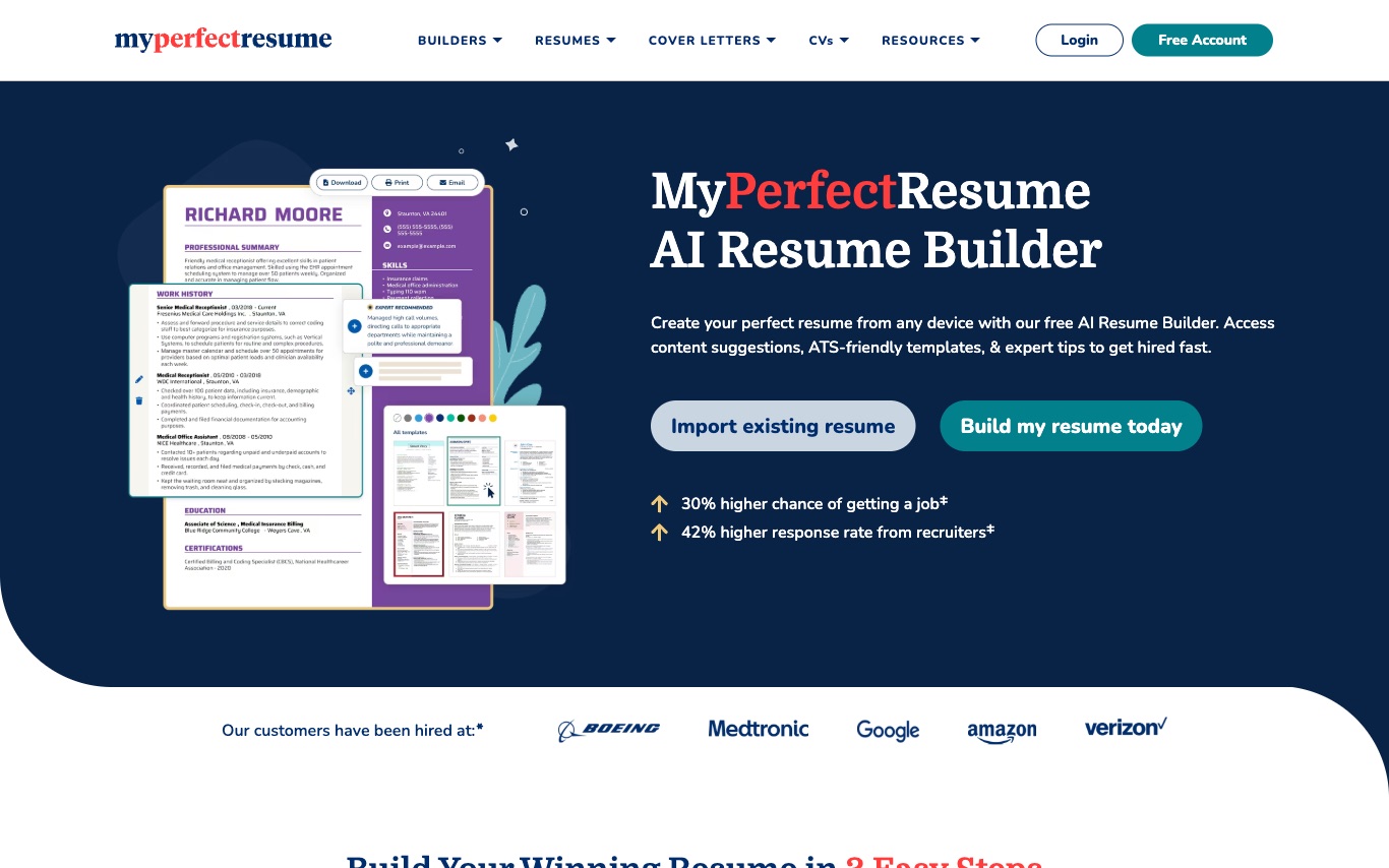 MyPerfectResume is an AI resume builder with 40+ ATS-friendly templates, pre-written bullet points tailored by job title, cover letter generation, and resume scoring—designed to help job seekers create polished applications in minutes.