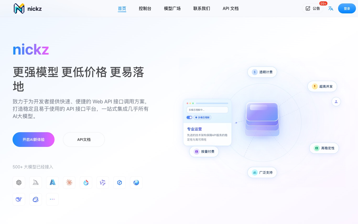 nickz is a developer-focused API gateway that gives fast, reliable access to 500+ large language and multimodal models. It offers pay-as-you-go billing, transparent pricing, high-concurrency infrastructure, and a dashboard for managing keys and usage across providers.