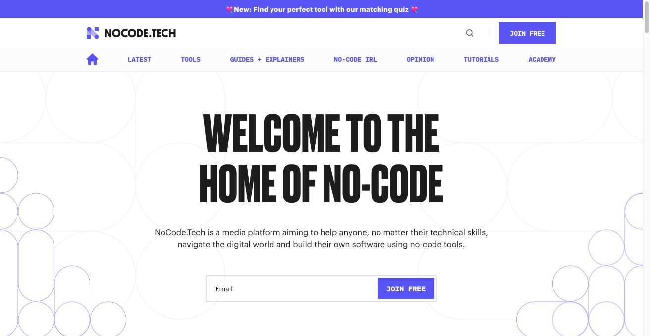 NoCode is a community hub for makers building without programming. It curates no-code tools, tutorials, templates, and updates for builders.