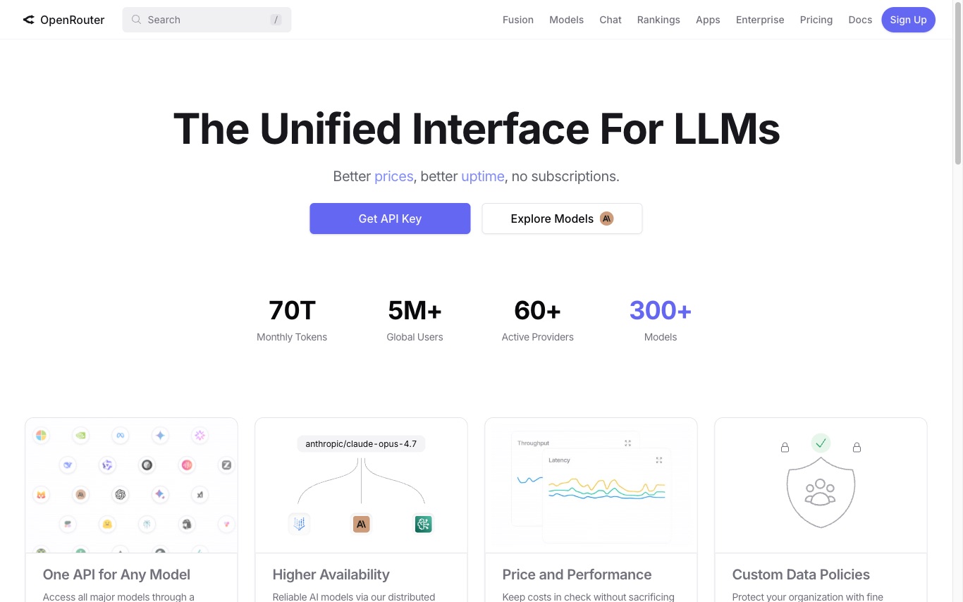 OpenRouter is the unified interface for large language models, routing prompts to 300+ models across 60+ providers. It finds the best price and uptime for each request, supports custom data policies and enterprise features, and handles over 70 trillion tokens per month from 5M+ global users.