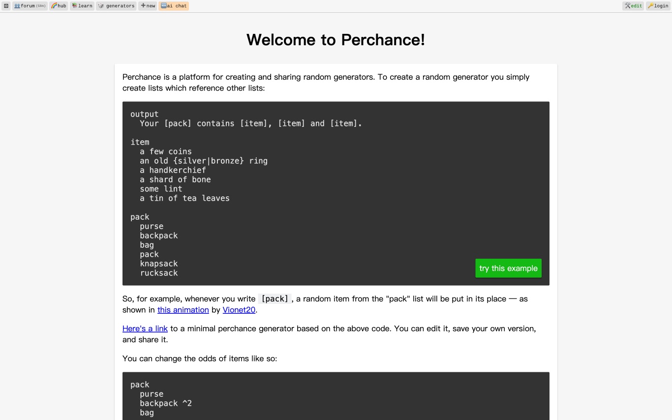 Perchance is a community-driven platform for building and sharing random generators, AI text adventures, image generators, and chatbots—using a beginner-friendly scripting syntax that requires no coding background.