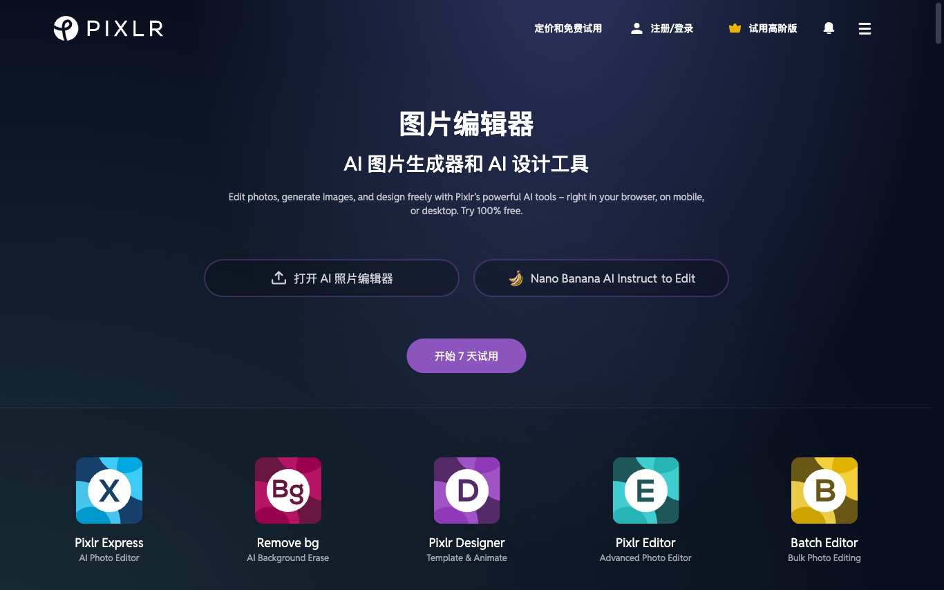 Pixlr is a free browser-based photo editing suite with AI-powered enhancement, background removal, batch processing, animation design, and text-to-image generation—serving casual editors who need quick results without installing software.