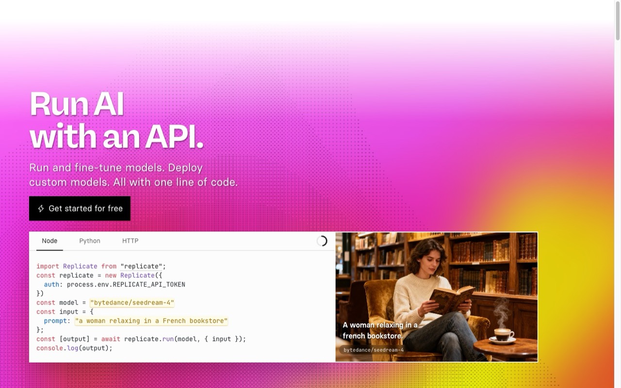 Replicate is a cloud platform for running and deploying machine learning models. Developers can call thousands of open-source models through one API line, fine-tune them on custom data, and deploy their own models with usage-based pricing—no GPU infrastructure management required.