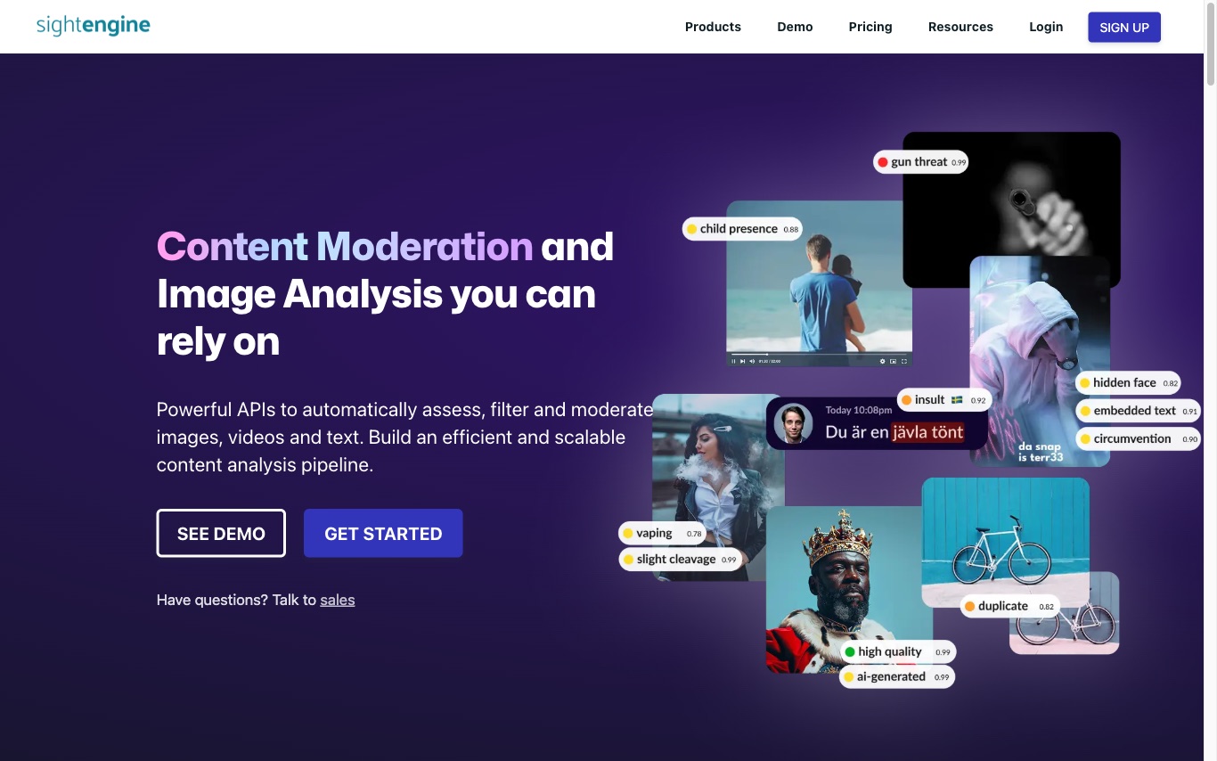 Sightengine is an image and video moderation API. Detect nudity, violence, weapons, drugs, text overlays, AI-generated content, and more with simple REST endpoints trusted at scale.