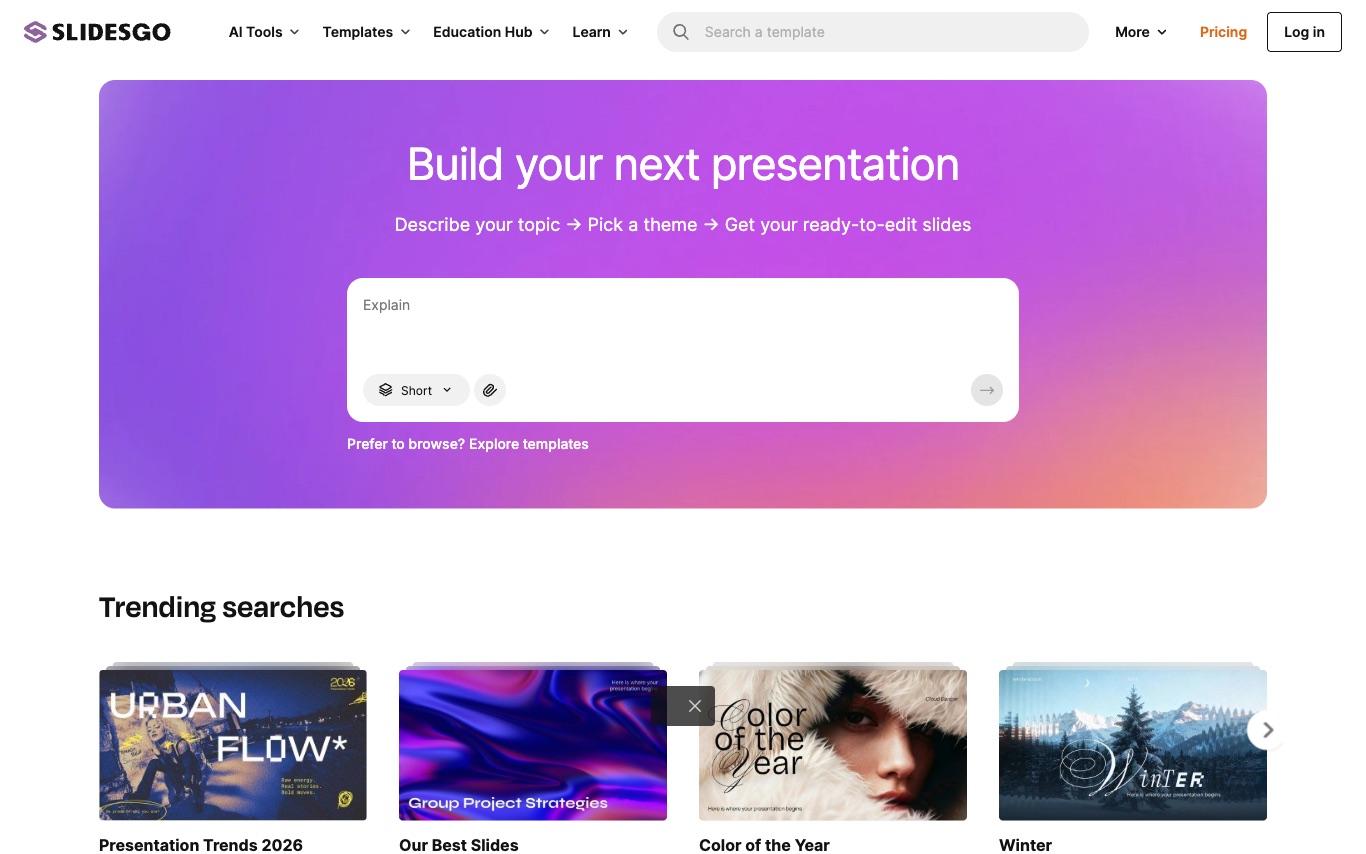 Slidesgo offers thousands of free presentation templates for Google Slides and PowerPoint alongside an AI slide generator—used by educators, students, and marketers who need polished decks without starting from scratch.