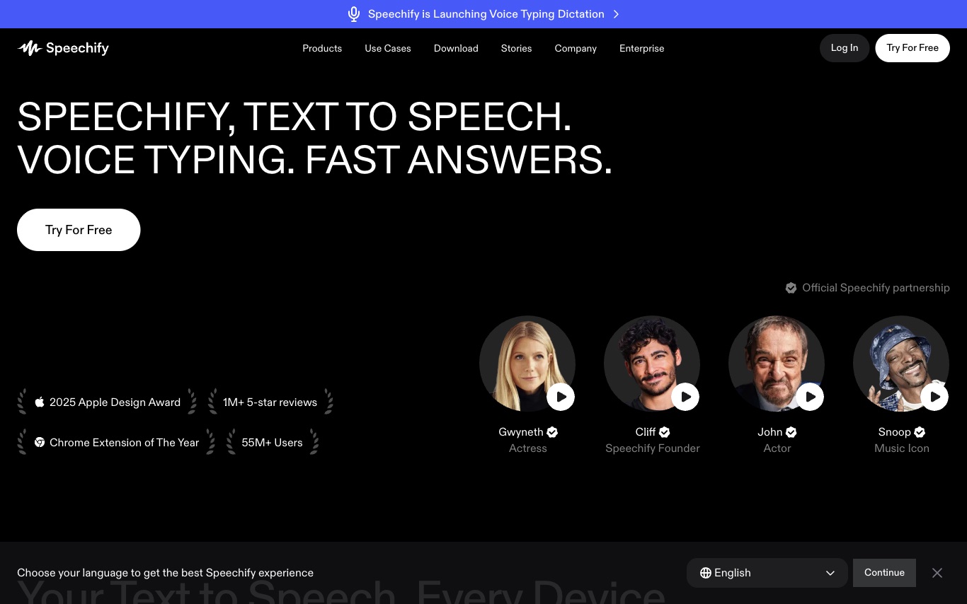 Speechify is a text-to-speech platform with 55M+ users that reads documents, PDFs, web pages, and books aloud using natural AI voices—available as a web app, Chrome extension, and mobile app with voice typing and studio dubbing features.