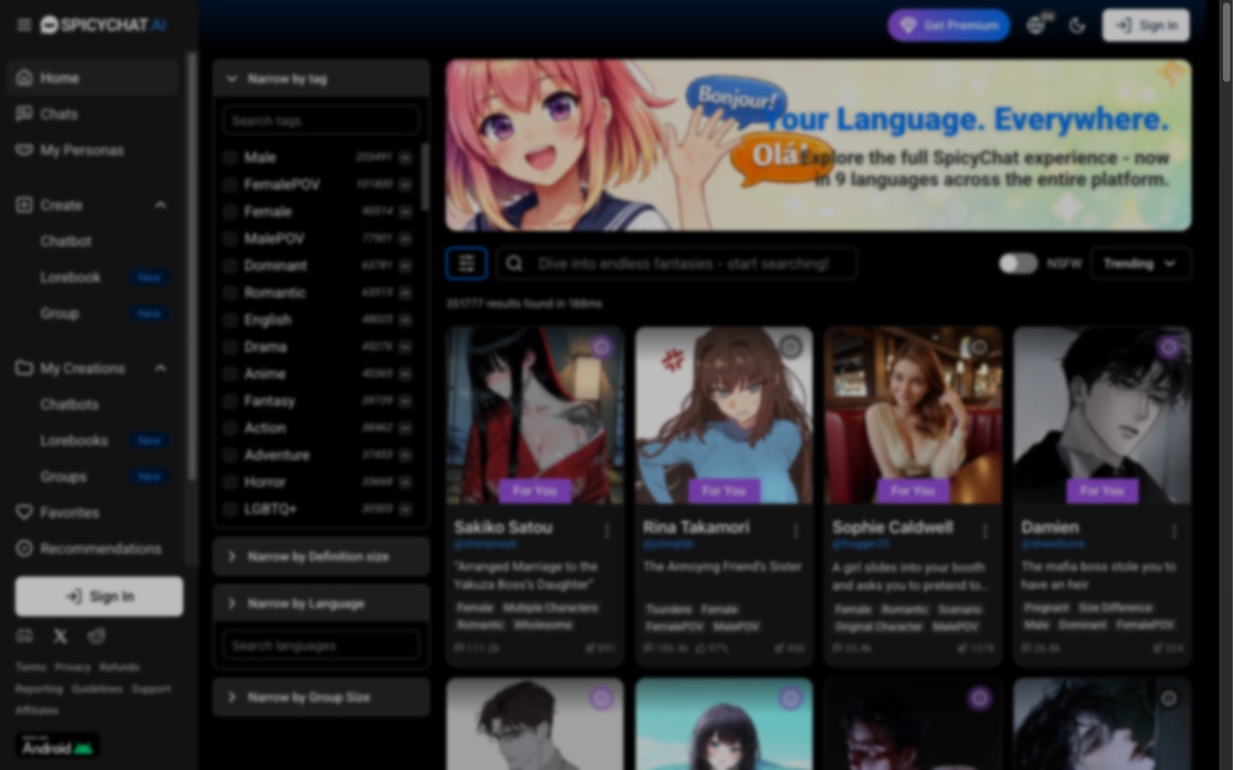 SpicyChat is an adult AI chatbot community where users roleplay with uncensored characters, build shared lorebooks, and browse a tag-driven catalog of fictional personas created by the community.