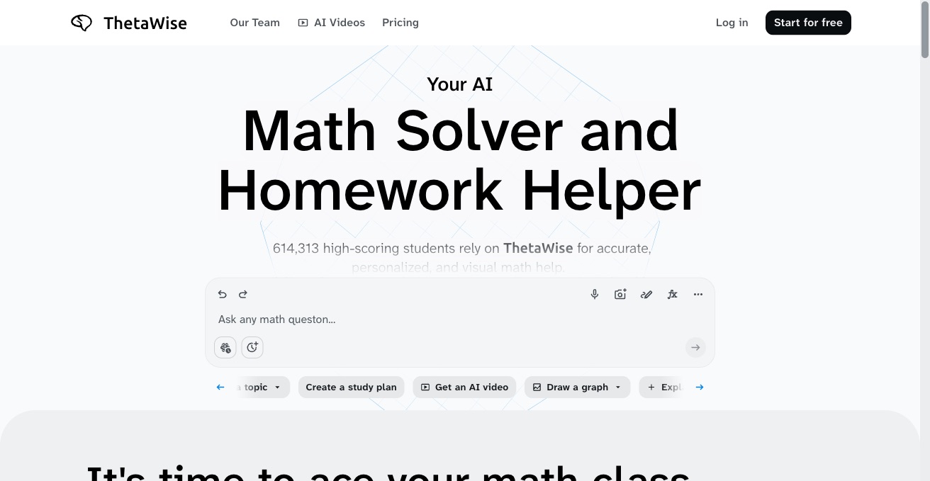 Thetawise is a free AI math tutor and solver. Ask arithmetic, algebra, calculus, or statistics questions and receive step-by-step explanations and answers.