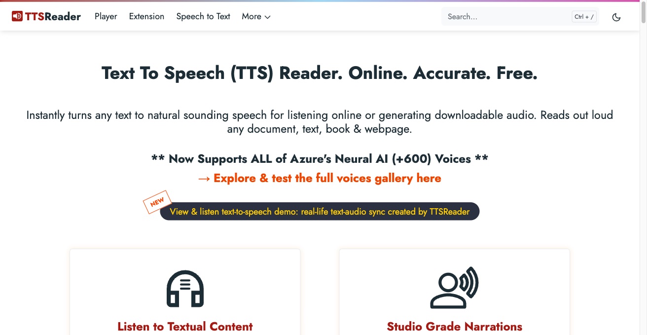 TTSReader is a free online text-to-speech reader that reads articles, PDFs, and pasted text aloud in multiple languages and voices, with a clean UI and no install.