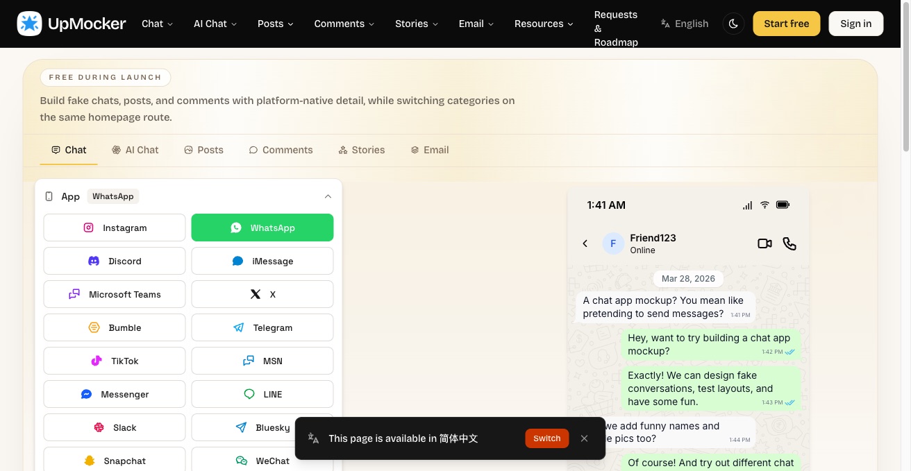 UpMocker is a free generator for realistic fake chat, comment, and story screenshots. Creators use it for pranks, jokes, and mockups of iMessage, Instagram, and more.