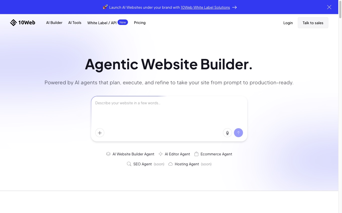 10Web 是基于 AI 的 WordPress 建站与托管平台,AI Agent 会根据描述规划、生成并部署一整套 WordPress 网站——版式、文案、图片、电商配置全部包含——部署到自带托管上,你可以继续自定义。