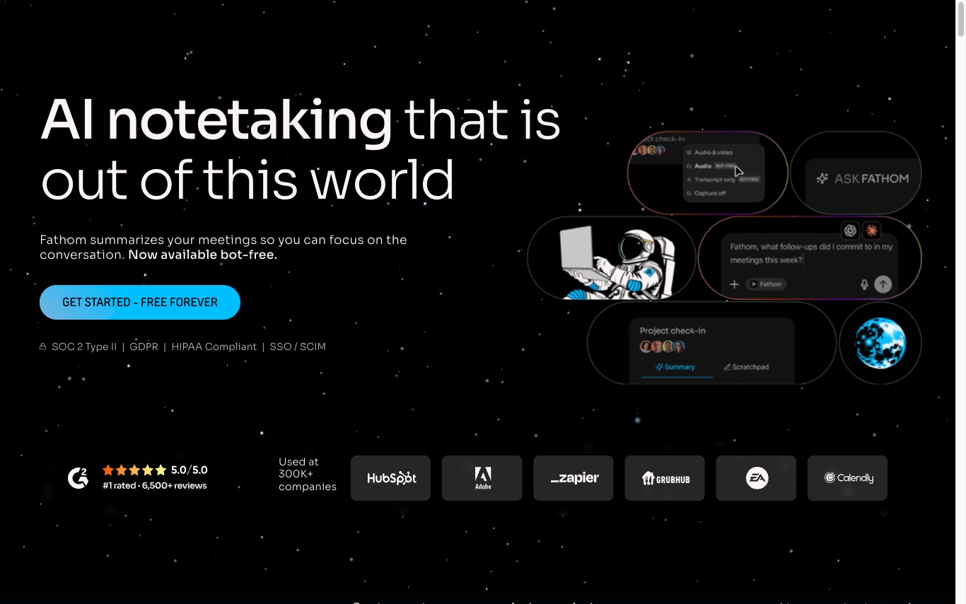 Fathom 是 AI 会议记录工具,在 30 万+ 公司使用,可摘要会议、无机器人录制,并把数据推送到 ChatGPT 和 Claude。