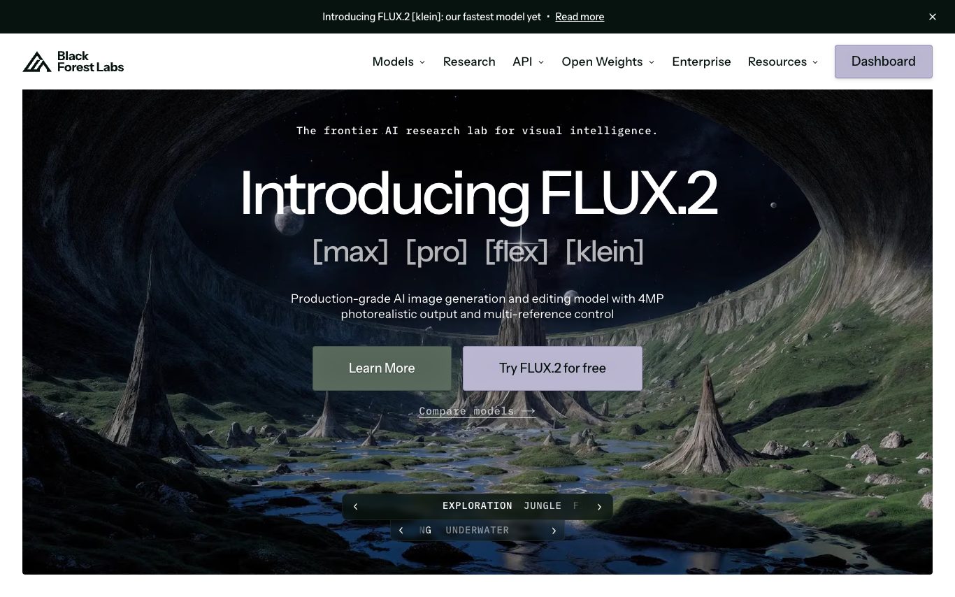 Black Forest Labs 推出的 FLUX 图像生成模型,以提示遵循度、字体呈现与写实效果著称。