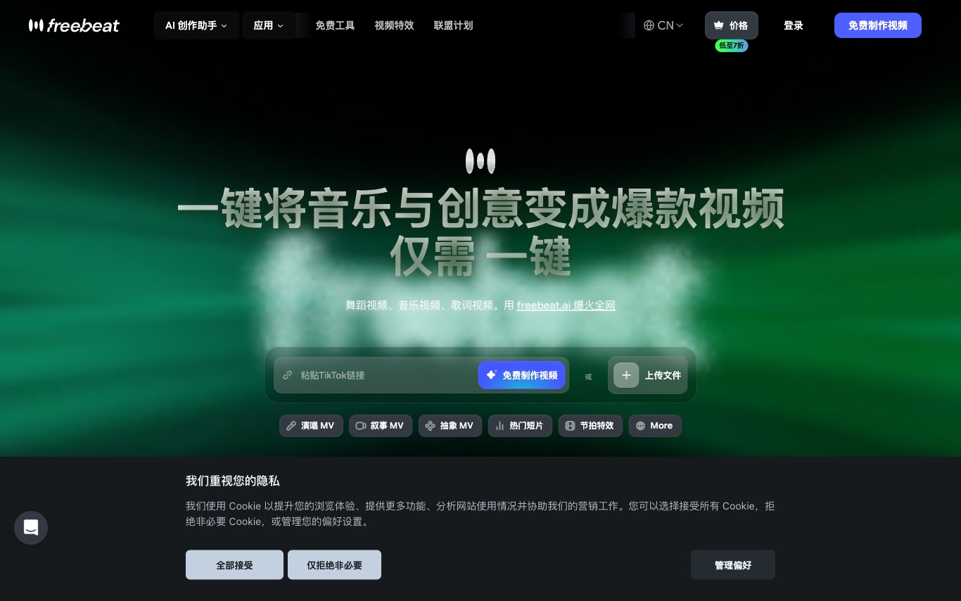 freebeat 是 AI 音乐视频生成器,100 万+ 创作者使用。上传或生成一首歌,即可输出节奏同步的舞蹈、叙事或歌词 MV。