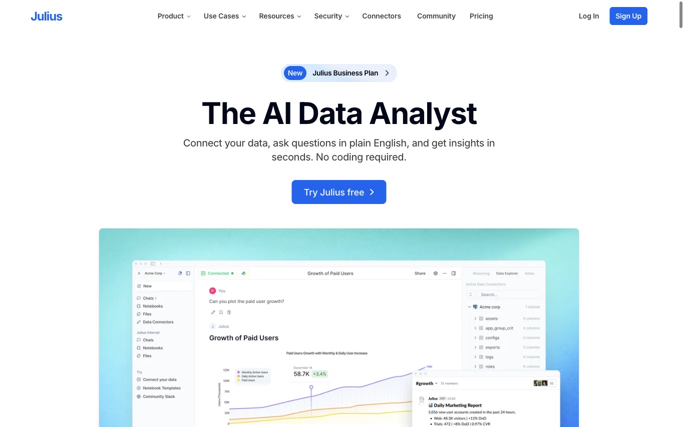 Julius 是 AI 数据分析师,200 万+ 用户使用。连接 Excel、PDF 或数据库,用自然语言提问即可获得图表、表格与完整报告。
