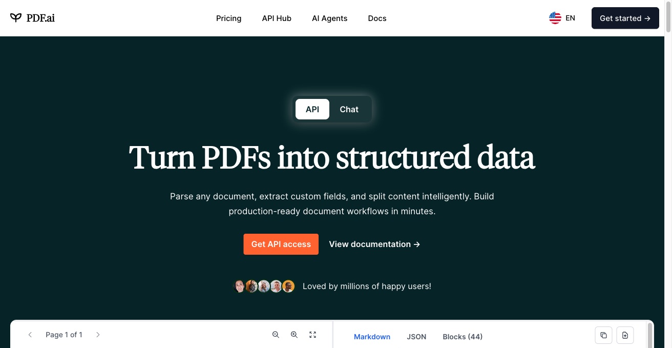 PDF.ai 既面向用户提供 PDF 对话,也向开发者提供 AI 驱动的 API 解析、字段抽取和智能拆分文档,被百万用户与常春藤学生使用。