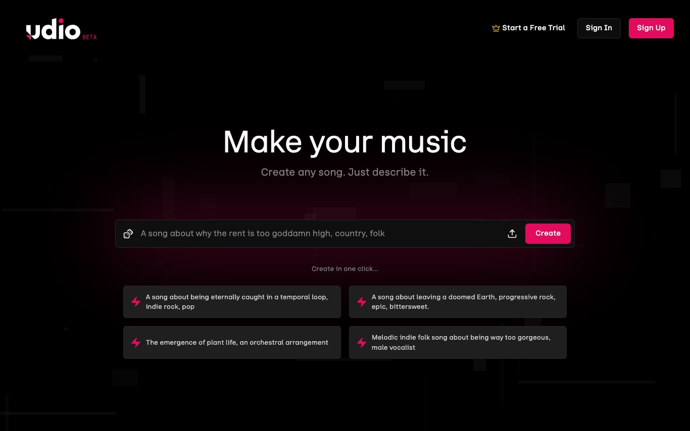 Udio 是基于浏览器的 AI 音乐生成平台。用户通过文字描述歌曲、选择风格,Udio 即可生成带乐器与演唱的完整曲目。编辑工具支持逐段迭代、延长或 remix 歌曲,付费档位还包含可用于社交与商业的音频导出与商用授权。
