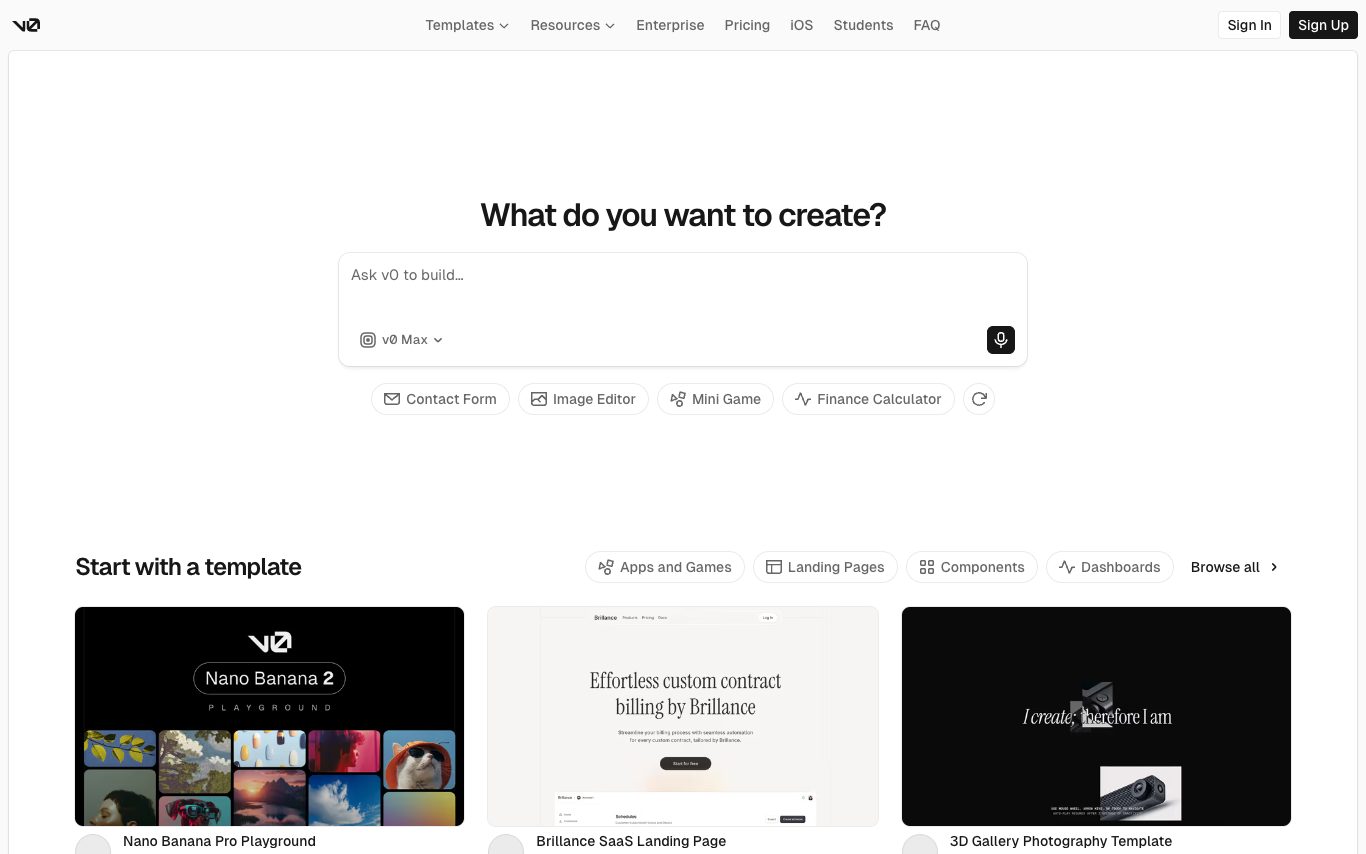 v0 是 Vercel 的生成式 UI 工具。用户描述界面或粘贴截图,v0 会返回使用 Tailwind CSS 与 shadcn/ui 的干净 React 与 Next.js 组件。结果会在即时预览中渲染,可通过对话继续迭代,并一键部署到 Vercel。