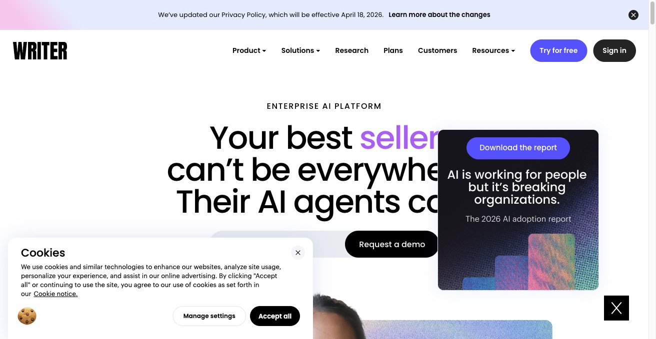 WRITER 是面向 Fortune 500 企业的 AI Agent 平台,团队可把营销、合规、运营等工作交给受治理的 AI Agent 执行。